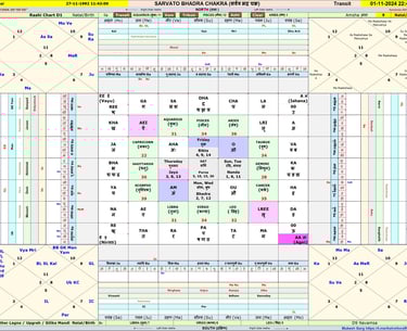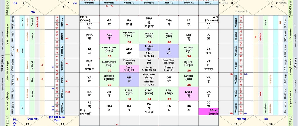 Sarvato – (सम्पूर्ण) Everything, Everywhere, Entirely Bhadra – (आकाशीय खगोल), Auspicious / Inauspicious, Wellbeing There are 9 X 9 = 81 Squares in the chart Outer 7 X 4 = 28 Squares represent Nakshatra (including Abhijit) Five innermost squares represent weekdays / Tithi’s & Centermost is ● Nanda Tithi (1, 6, 11) & Sunday, TuesdayVarga 74 ● Bhadra Tithi (2, 7, 12) & Monday, Wednesday Varga 76 ● Jaya Tithi (3, 8, 13) & Thursday Varga 78 ● Rikta Tithi (4, 9, 14) & Friday Varga 80 ● Poorna Tithi (5,10, 15, 30) & Saturday Varga 81 Rashi are just outside the border of Tithis / Weekdays Rest the Squares contains Consonants & Vowels Sarvato Bhadra Chakra - 16(Vowels) + 20(Consonants) + 12(Rasis) + 28(Nakshatras) + 5(Tithis and Weekdays) = 81